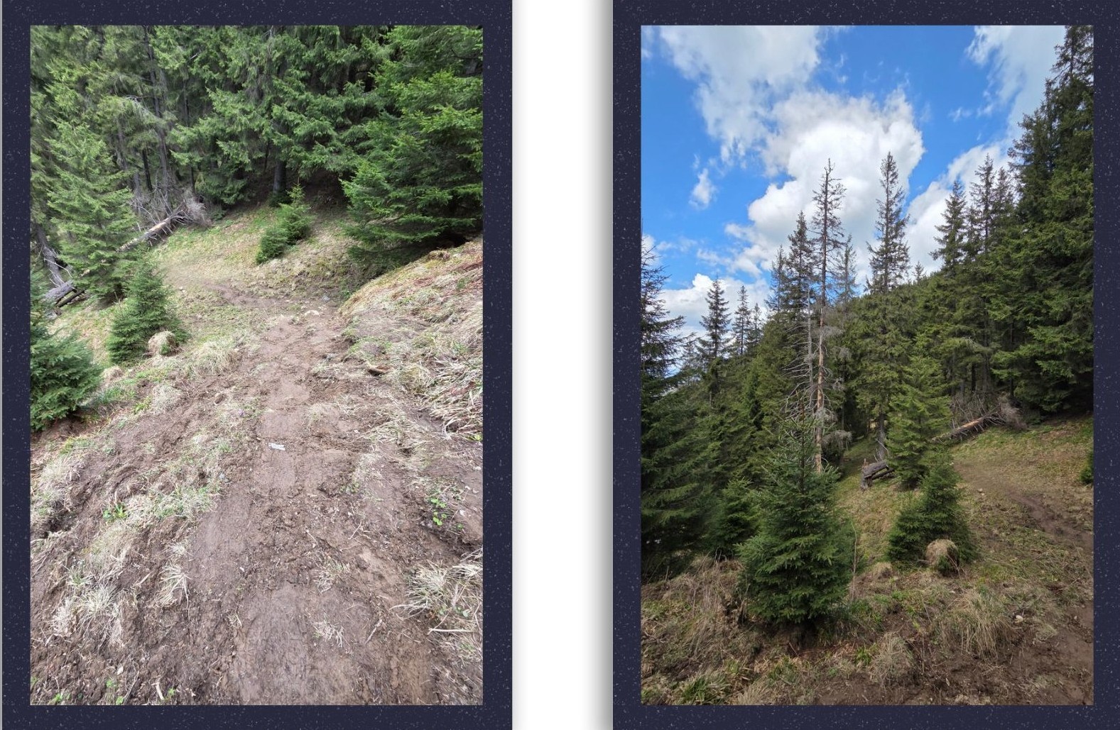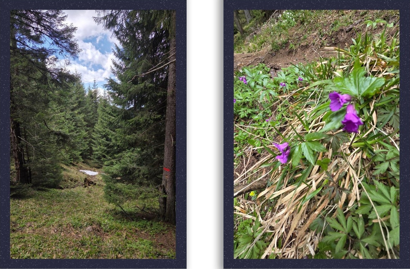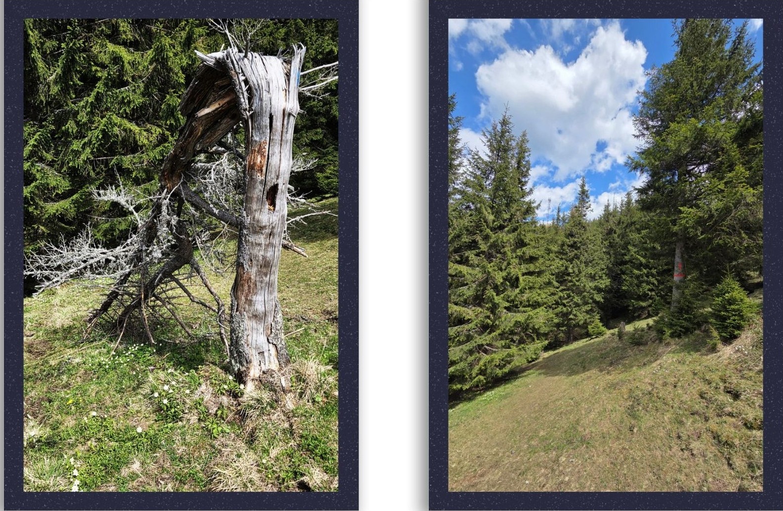 Am ajuns la stânile părăsite și am început să mergem spre pădure spre stânga, firește, până am dat de copacul cu dungă roșie care ne-a arătat locul în care era timpul să intrăm pe poteca din pădure pe care să începem coborârea.